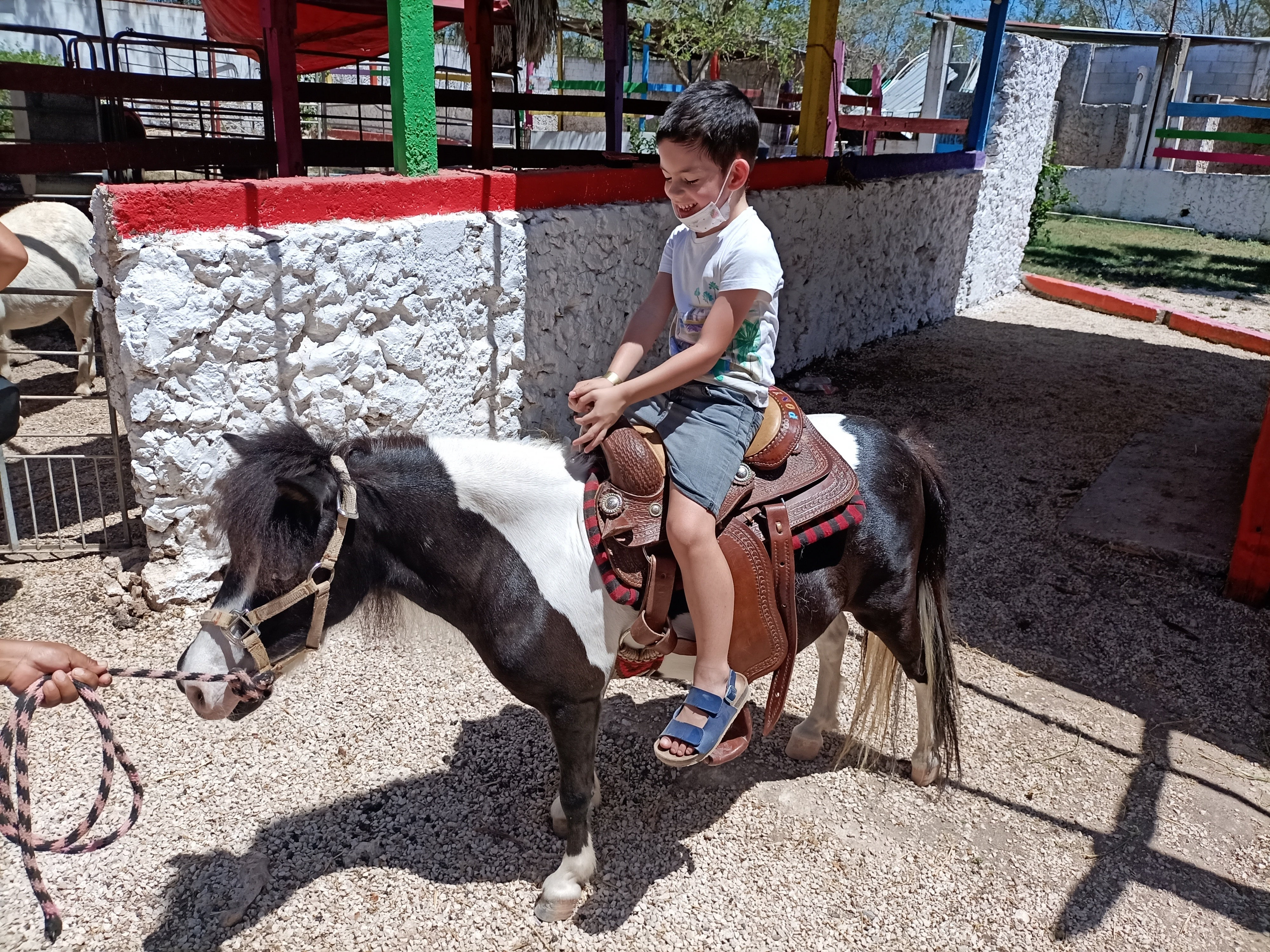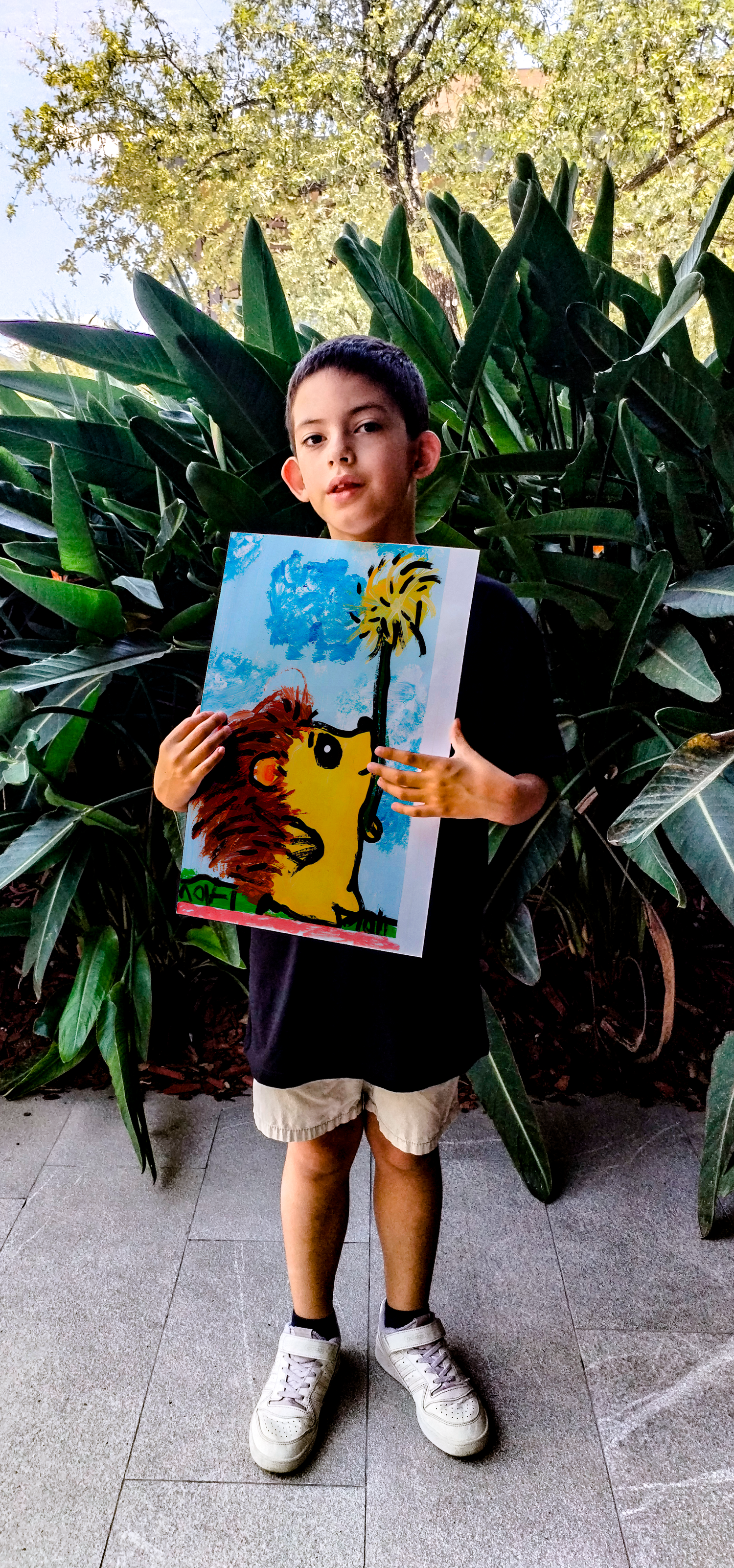 Con el amor como mi luz guía, mis padres se aseguraron de que recibiera el apoyo que necesitaba. Me encontraron programas de educación especial que me ayudaron a aprender a mi manera. Pude explorar la terapia artística, ¡lo que me abrió un mundo completamente nuevo! Me encantaba expresarme a través de colores y formas. También hicimos terapia de comunicación, lo que me ayudó a aprender a compartir mis sentimientos y conectarme con la gente. Una de mis terapias favoritas fue la terapia con caballos: pude pasar tiempo con estos gentiles gigantes y me hicieron sentir tranquilo y comprendido. Con el tiempo, sentí que estaba creciendo, que mi arte finalmente podía escapar de mi mente y tomar forma en el papel y en mi pizarrón.